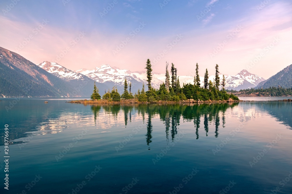 Billede på lærred Battleship Island with Pine Trees reflected in calm water of Garibaldi Lake Land