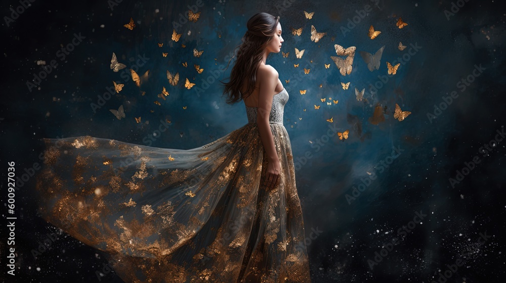 Billede på lærred beautiful woman walking surrounded with butterfly, Generative Ai