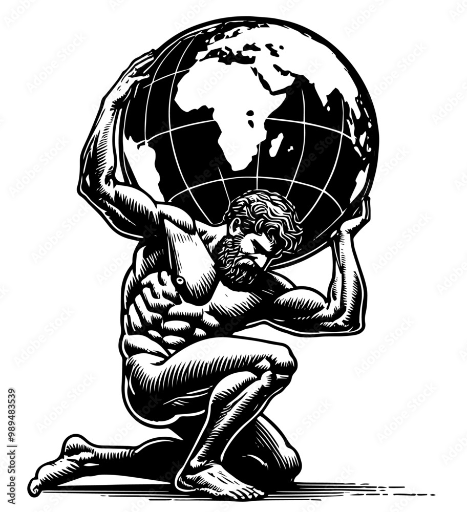 Billede på lærred black and white vector of atlas holding the earth in line art style