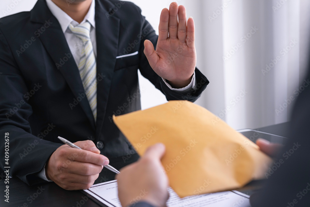 Billede på lærred Businessman or accountant is rejecting and resisting partner bribery deals in joint financial settlement, illegal anti-bribery ideas