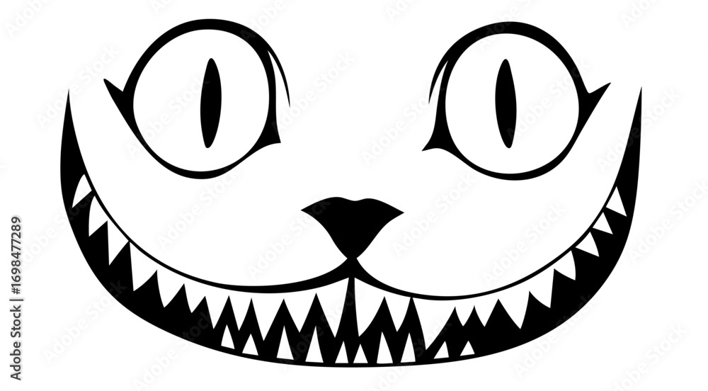 Fotografi Creepy Cheshire cat smile with glowing predator eyes, sharp jagged teeth, Alice