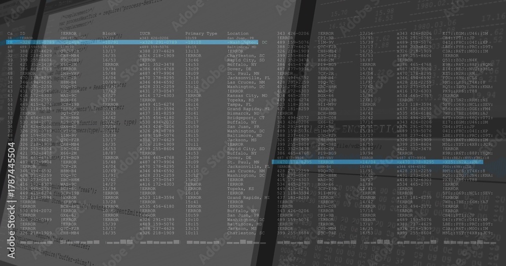 Fotografi Displaying two angled computer monitors showing terminal tabular text at desk, w
