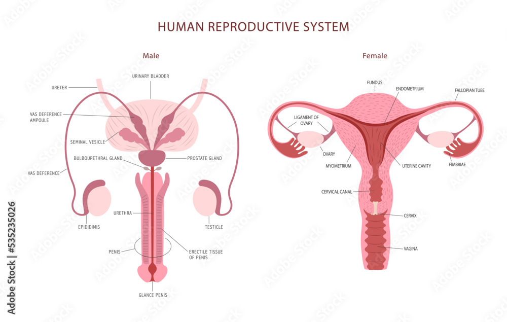 Fotografi Flat illustration of woman and man reproductive organs with captions for anatomy atlas, book or website