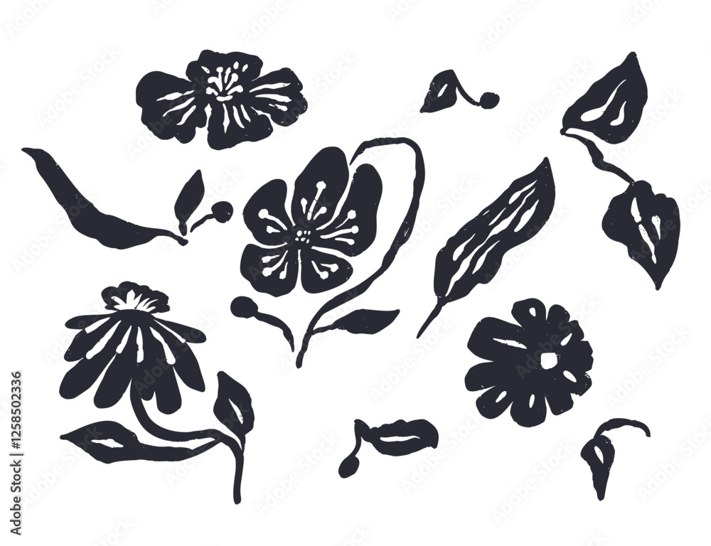 Fototapet Set of black abstract inky flowers and leaves isolated on white