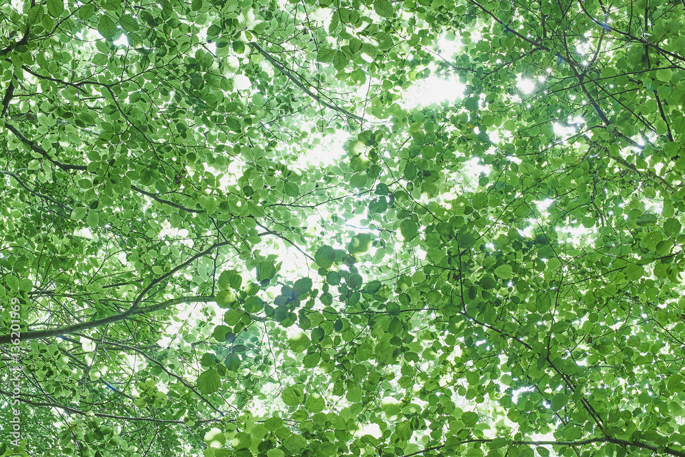 Fototapet Abstract tree canopy leaves looking up into bright light