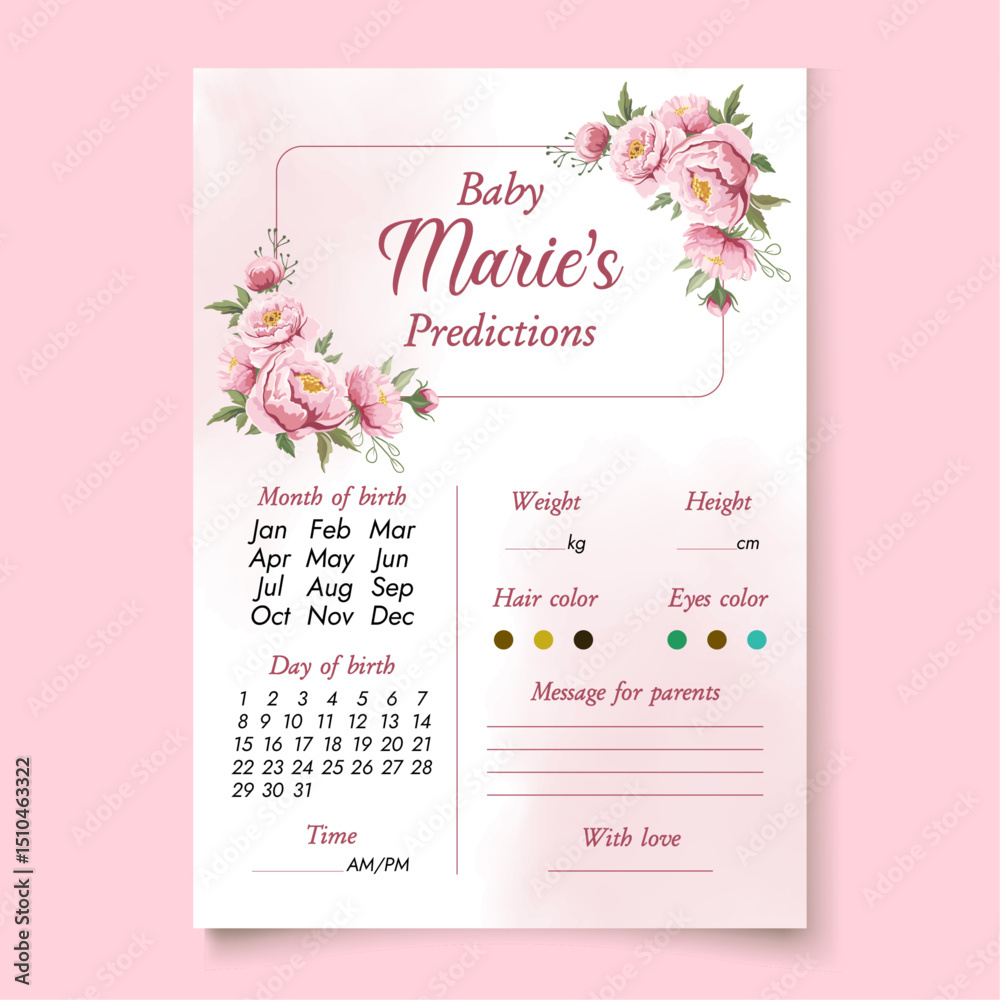 Fototapet Baby prediction template Baby shower pink invitation Its a girl Floral design