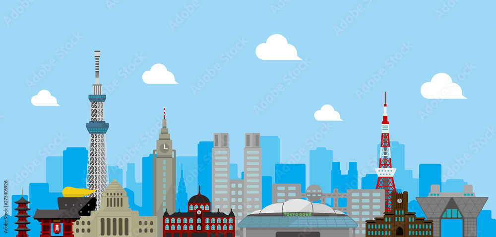 Fototapet Tokyo skyline flat vector illustration. Tokyo landmark buildings.