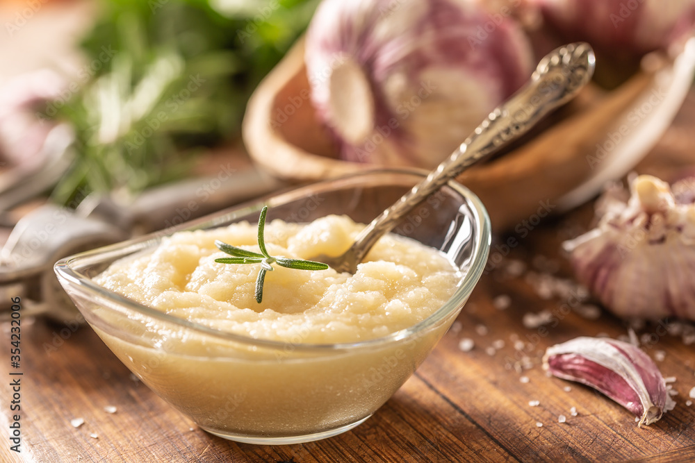 Fototapet Garlic paste in a glass bowl with peeled garlic, salt, crusher and garlic heads