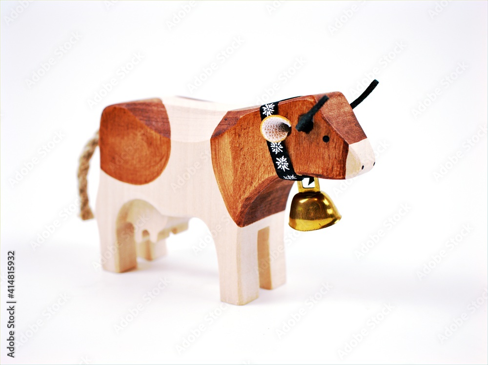 Fototapet Swiss cow toy wooden handmade souvenir isolated on white background ,cow on whit