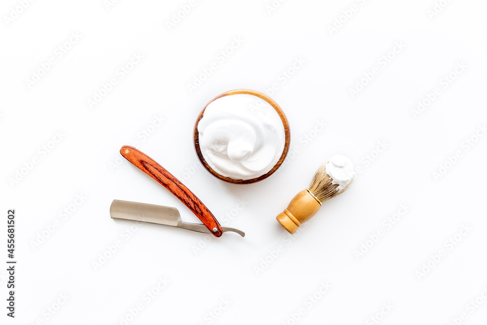Fototapet Shaving razor and foam in bowl - barber tools equipment