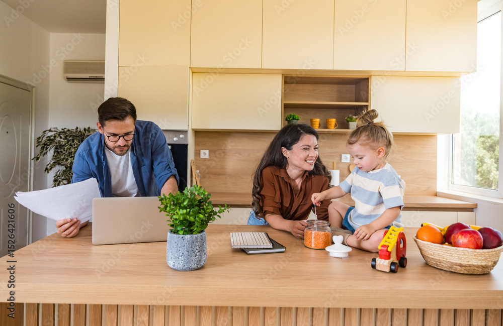 Vægklistermærke Joyful young family bonding in bright modern kitchen mother and daughter laughing while playing on countertop as father focuses on remote work, blending parenthood, love, and technology
