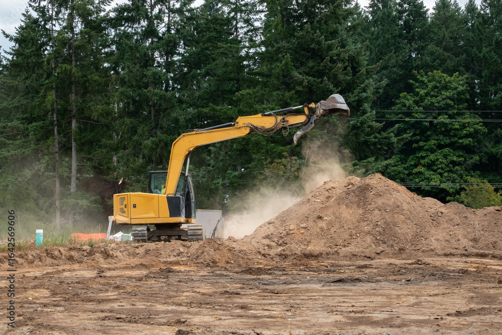 Vægklistermærke Earthworks phase of new home construction project, excavator digging up dirt, an