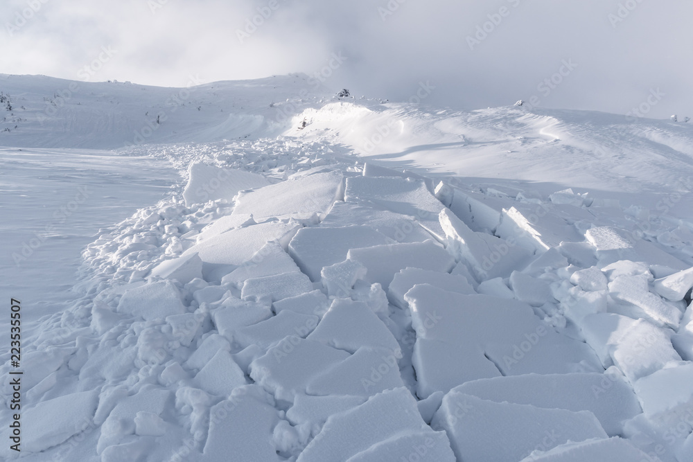Vægklistermærke Snow avalanche in winter mountains. Danger extreme concept