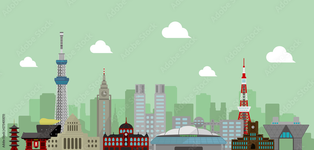 Vægklistermærke Tokyo skyline flat vector illustration. Tokyo landmark buildings.