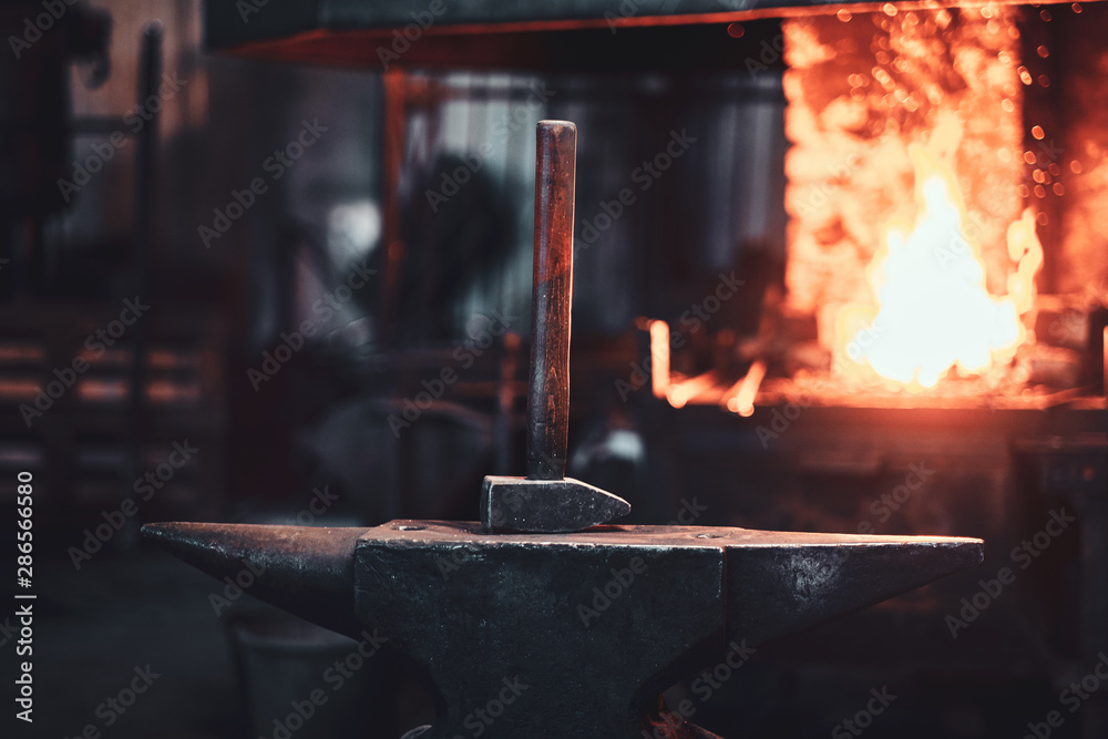 Vægklistermærke Hammer on anvil at dark blacksmith workshop with fire in stove at background