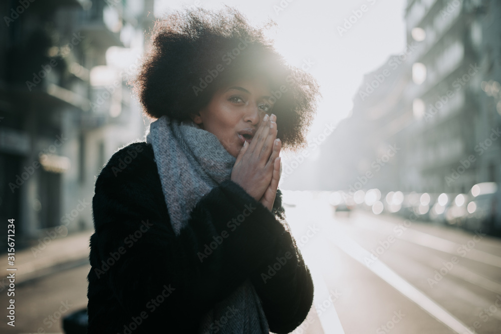 Vægklistermærke Beautiful girl with afro haircut walking on the street