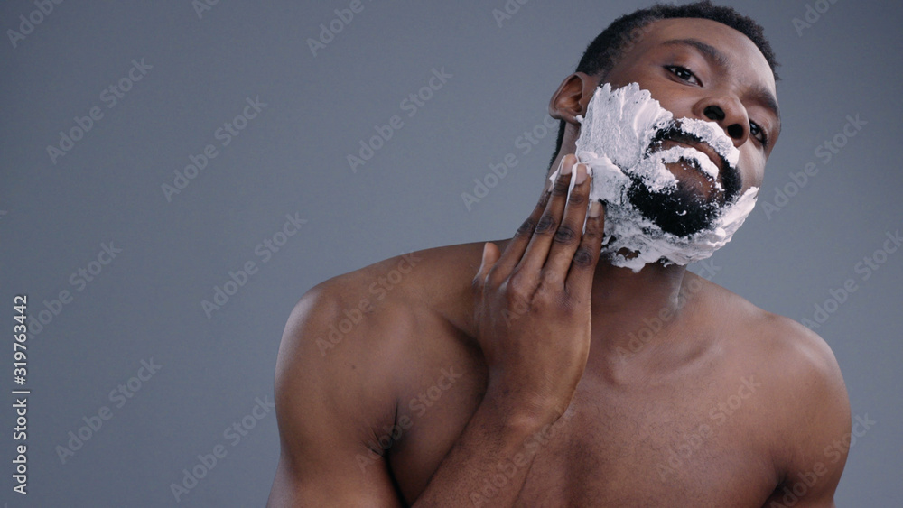 Vægklistermærke Close-up of handsome young afro-american shirtless man shaving and applying cream on his face