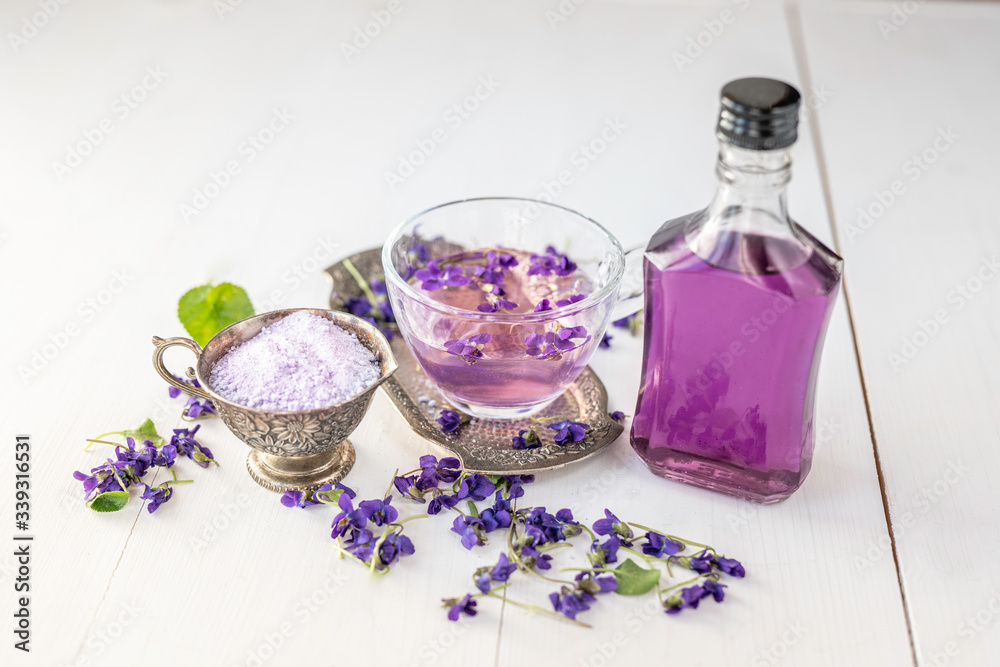 Vægklistermærke Cup of herbal violet violetta odorata tea with fresh spring blossom petals flowe