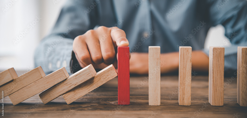 Vægklistermærke close-up hand The hand of a businessman who is stopping or preventing a falling block