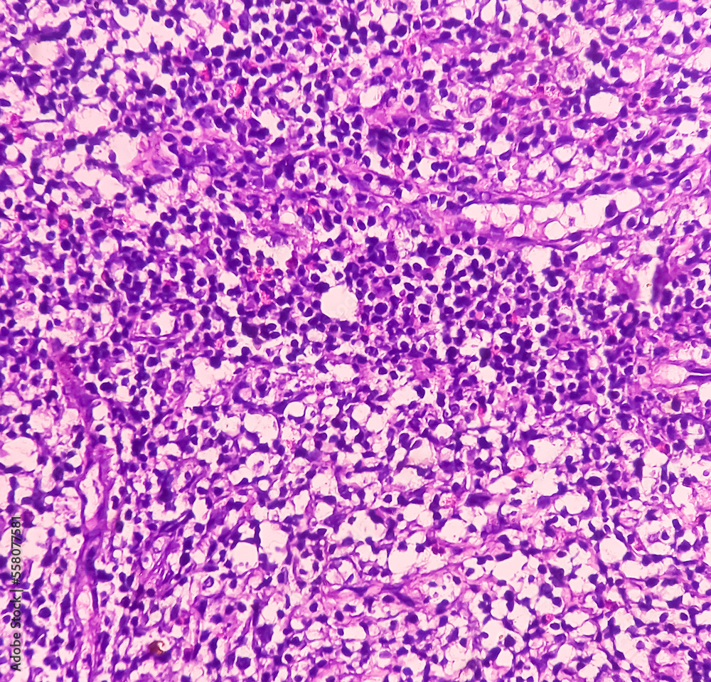 Vægklistermærke Lymph node (biopsy): Hodgkin's lymphoma, mixed cellularity, monotonous population of lymphocytes, histiocytes, plasma cell, large mononuclear cells