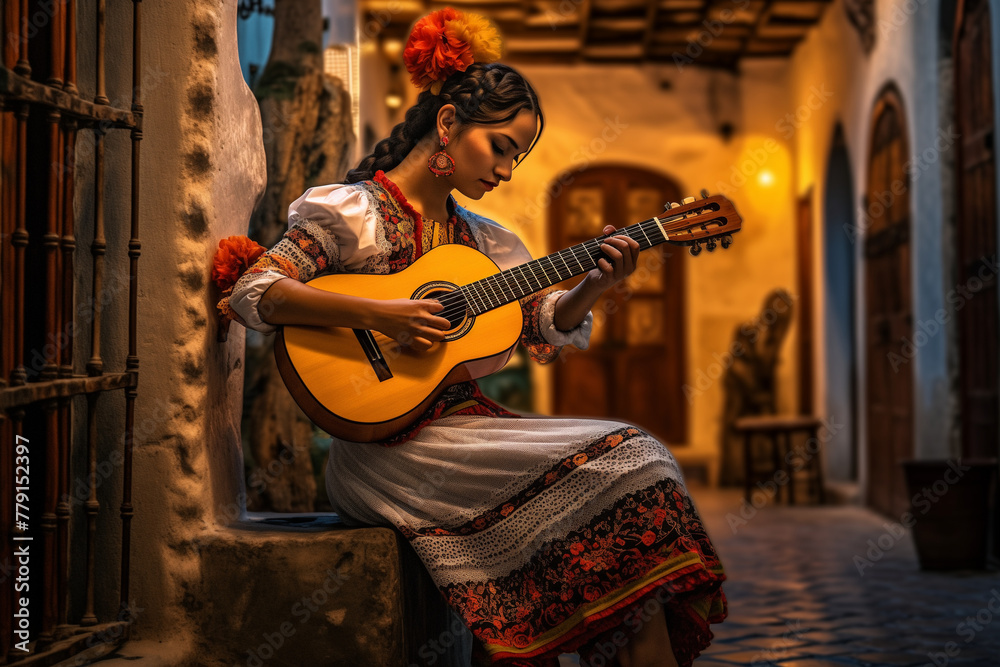 Vægklistermærke Mexican woman in national clothes strums a guitar in honor of Cinco de Mayo fest