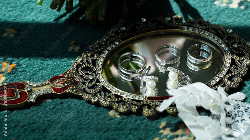 Billede på lærred Wedding rings and earrings lying on a mirror. Wedding accessories