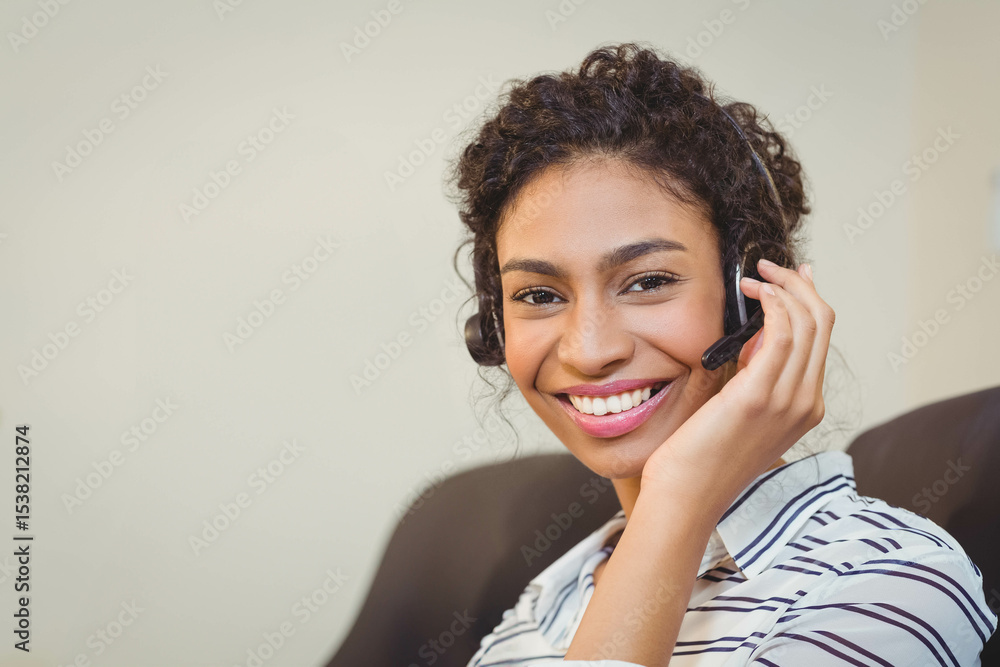 Billede på lærred Female service rep sitting on office chair in cubicle using headset mic while sm