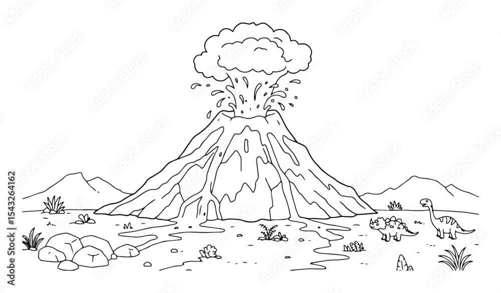 Billede på lærred volcano eruption outline vector illustration prehistoric landscape monochrome li