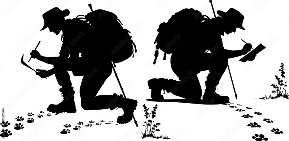 Billede på lærred Wildlife Tracker Examining Animal Tracks - Outdoor Exploration and Nature Study