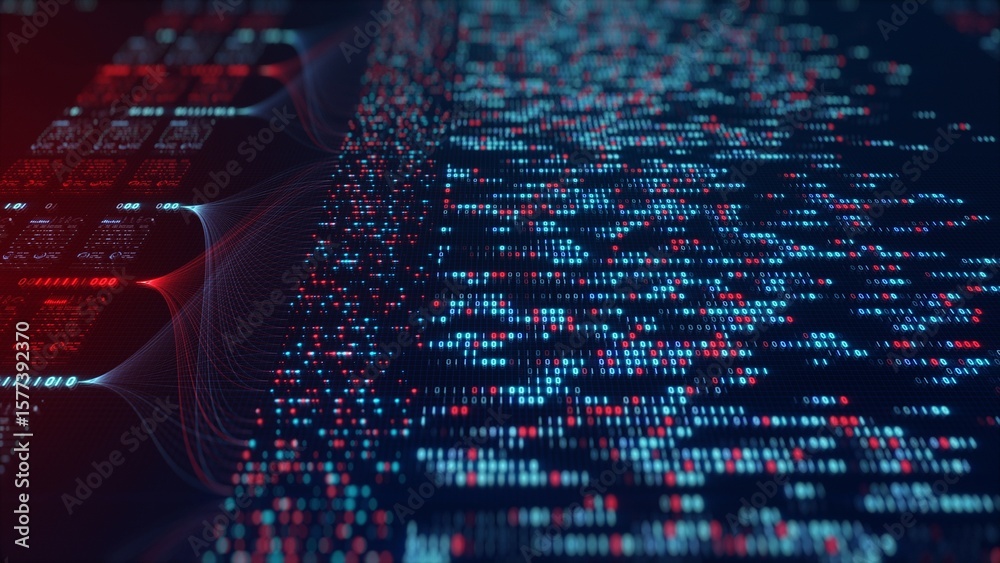 Billede på lærred Neural Network Big Data Flow Visualization, Binary Code Matrix, AI Machine Learn
