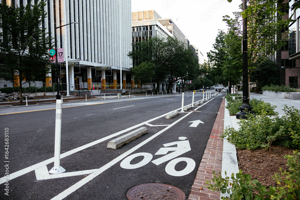 Billede på lærred Protected urban bike lane along city street with bollards and cycling arrows