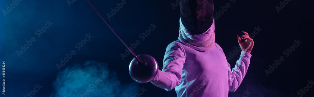 Billede på lærred Panoramic crop of swordswoman fencing on black background with smoke and lightin