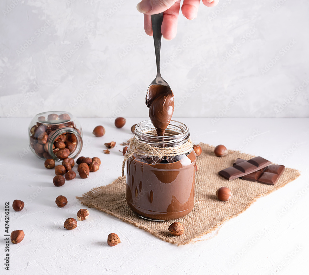 Billede på lærred Chocolate-nut paste in a glass jar on a light table