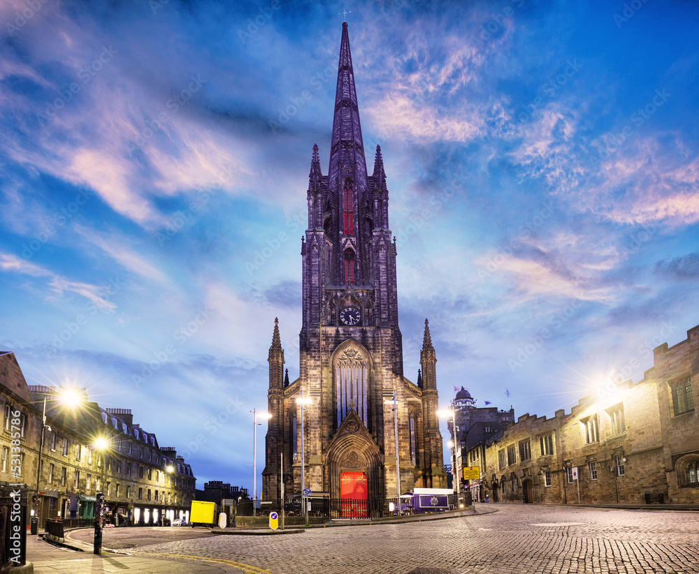 Billede på lærred Edinburgh old town at night with Tolbooth Kirk church