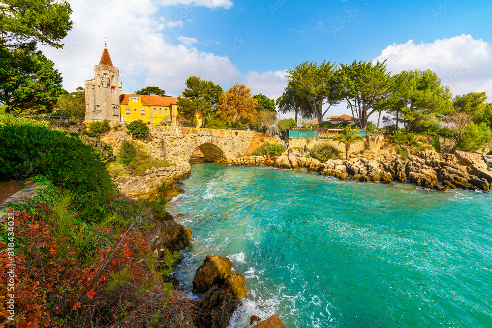Billede på lærred View from a small bay and cove along the rocky coastline of the Palace of Condes de Castro Guimaraes, a seaside museum along the Riviera at Cascais, Portugal