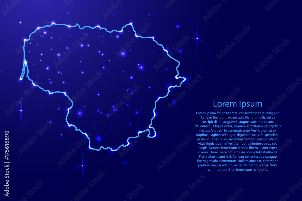 Fotografi Map Lithuania from the contours network blue, luminous space stars of vector ill