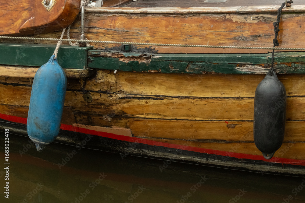 Billede på lærred Old wooden boat hull with fenders hanging showing signs of wear and tear