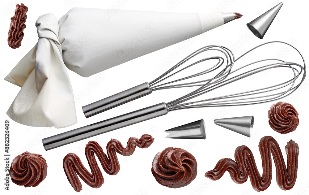 Fotografi Pastrie collection of piping bag, whisk and icing swirls - Ready to use Premium