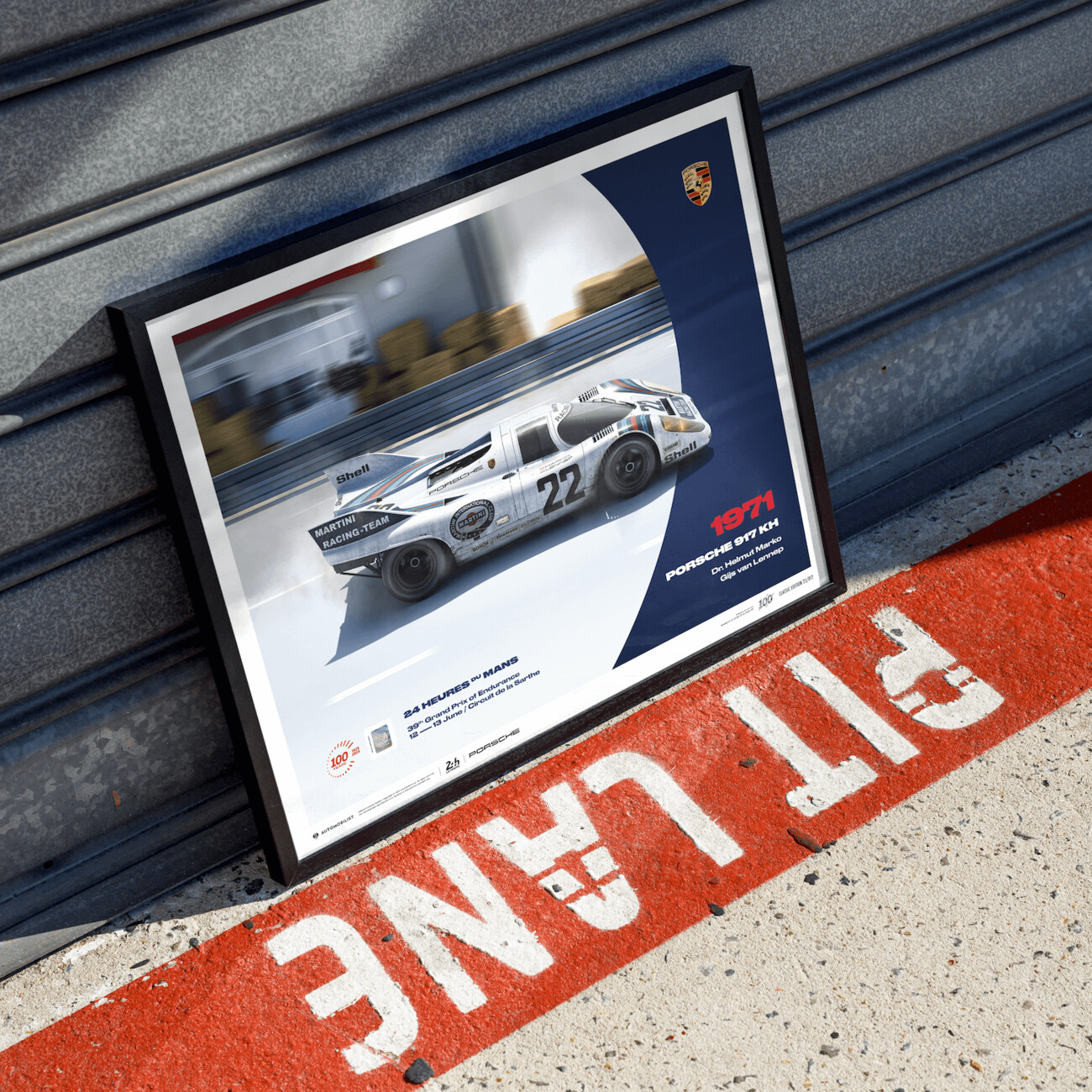 In 1971, the Porsche 917 KH in Martini livery won the prestigious 24 Hours of Le Mans race, setting two records with a distance of 5,335 kilometres and an average speed of 222.3 km/h. Driven by Gijs van Lennep and Helmut Marko, the car featured tail fins on both sides, giving it more directional stability and reducing drag. The car was also the first Porsche to race with a magnesium space frame, a material that was considerably lighter than aluminium, allowing for a 55-litre oil tank.