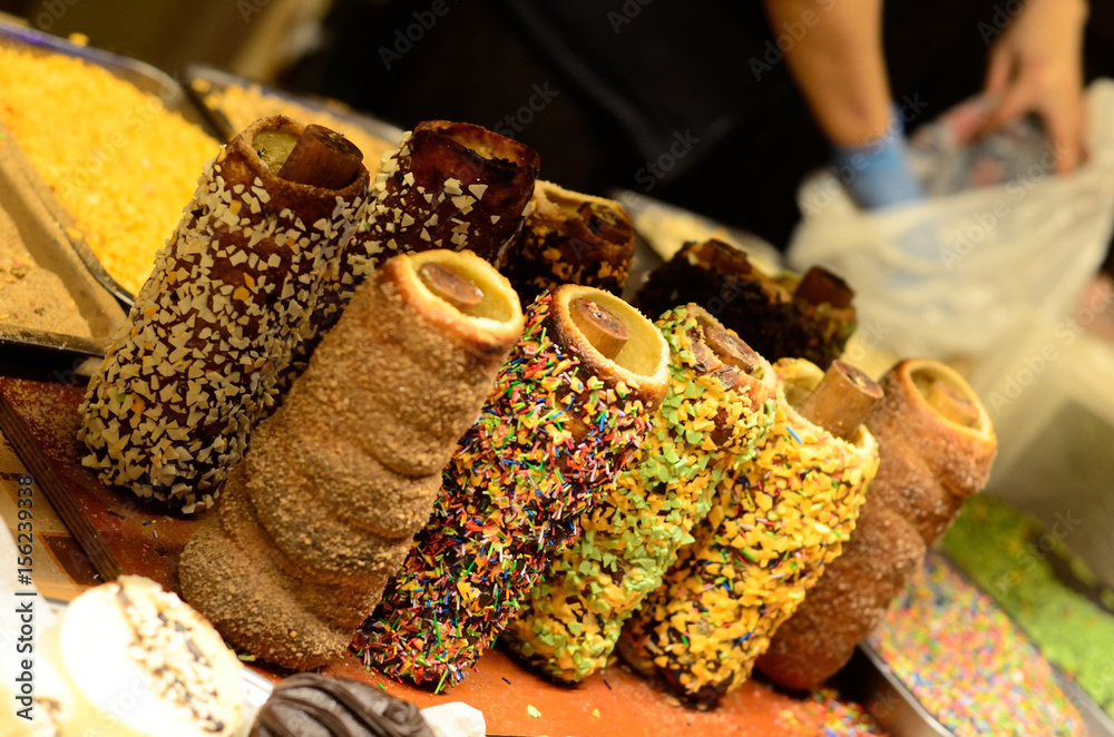 Fotografi Traditional national Czech sweet street food Trdelnik, is tubes