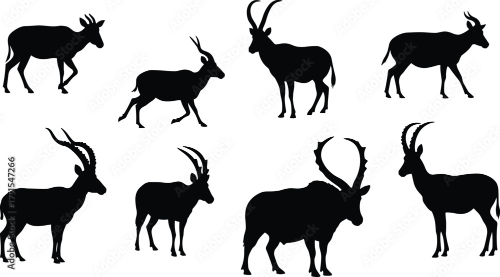 Fotografi Collection of deer and antelope silhouettes, wild animal vector set, horned mamm