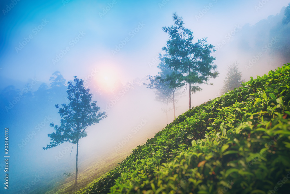 Fotografi Misty sunset over the tea plantations of Munnar, Kerala, India