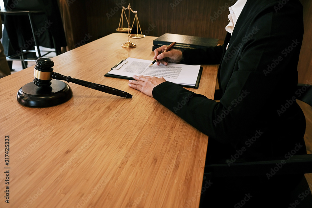 Fotografi Legal counsel presents to the client a signed contract with gavel and legal law