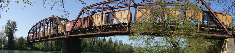 Fotografi Cargo train passing across a trestle in Eugene, Oregon.