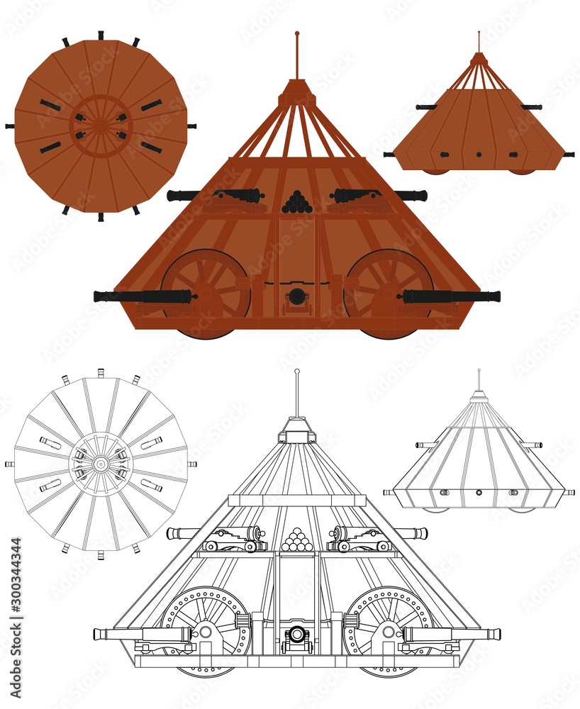 Fotografi Leonardo da Vinci armored vehicle invent colored.