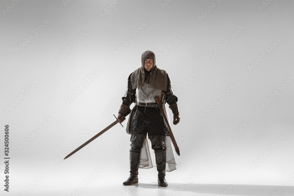 Fotografi Brave armored knight with professional weapon fighting isolated on white studio background