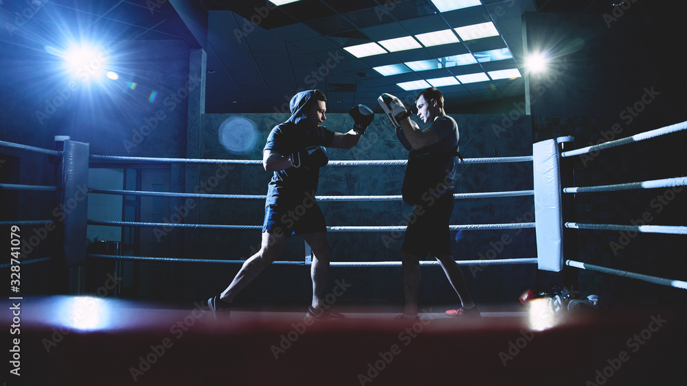 Fotografi Professional boxers with gloves train fights in indoor boxing ring, dark colors