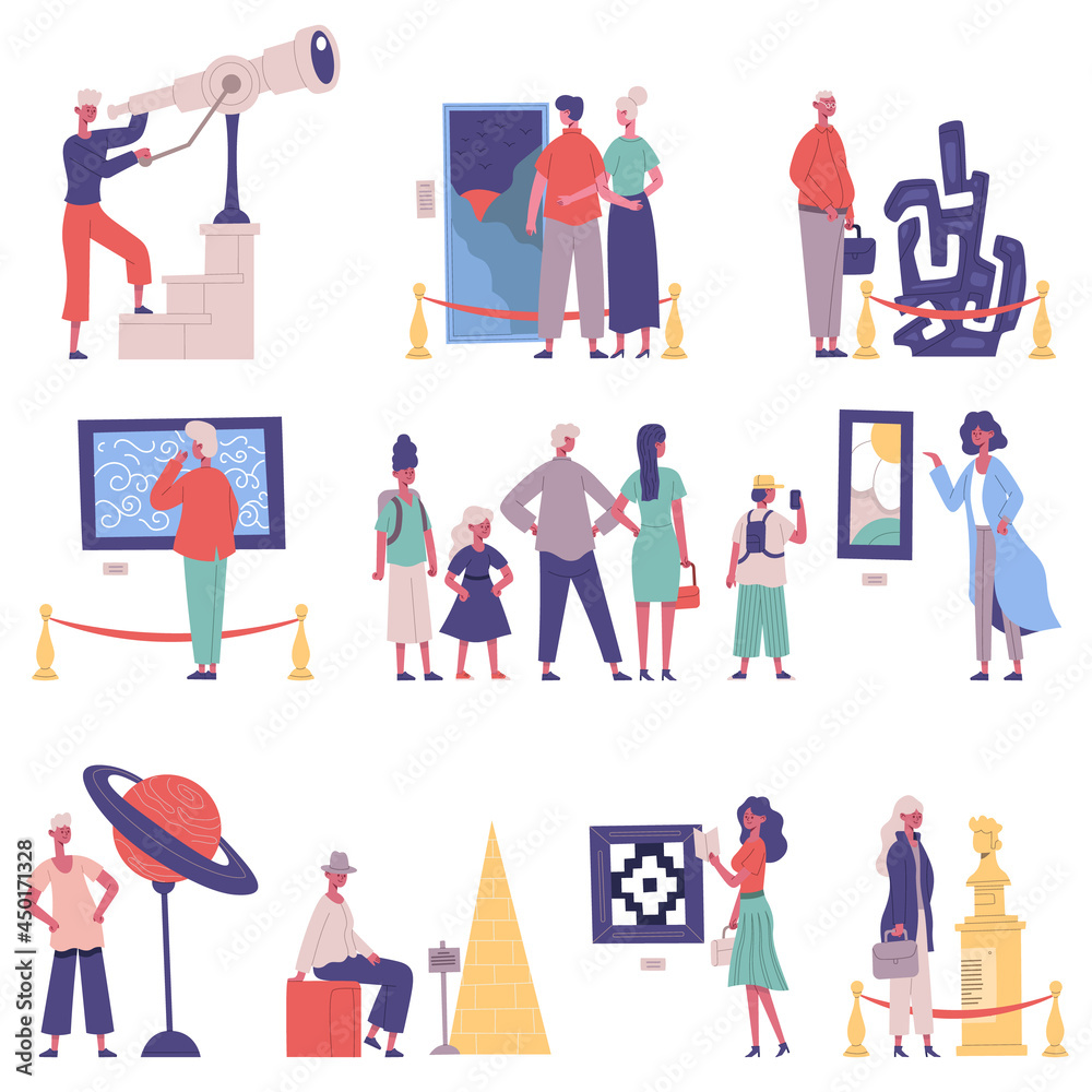 Fotografi Art gallery, museum exhibition visitors and guide characters