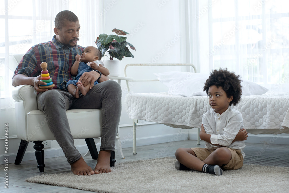 Fotografi African father holding and playing with little baby girl, child son siting on fl