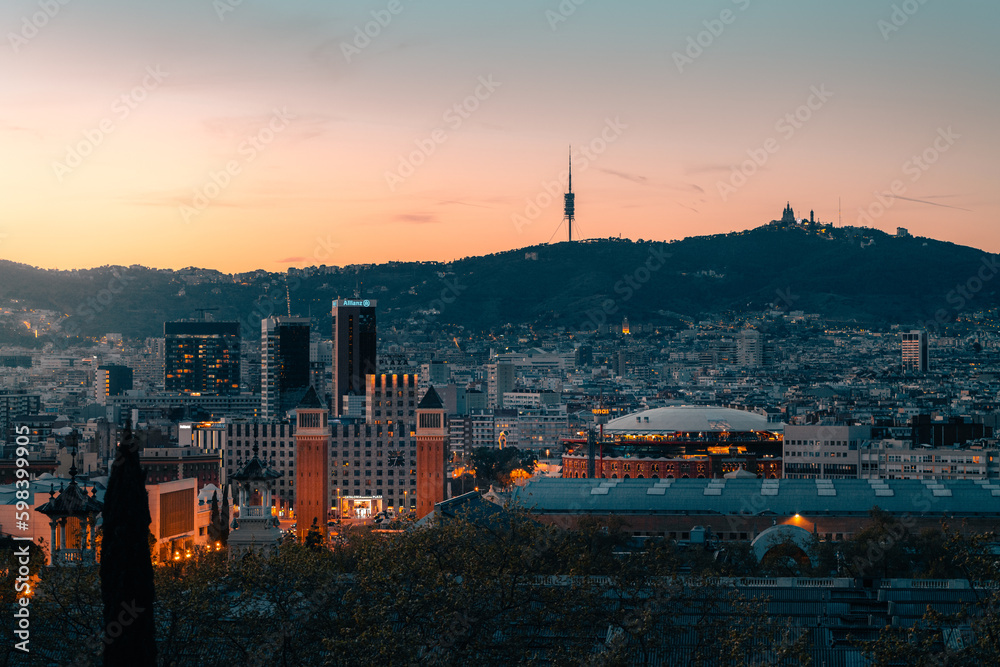 Fotografi Skyline of Barcelona (Catalonia, Spain) during golden hour at Sunset, from an ae
